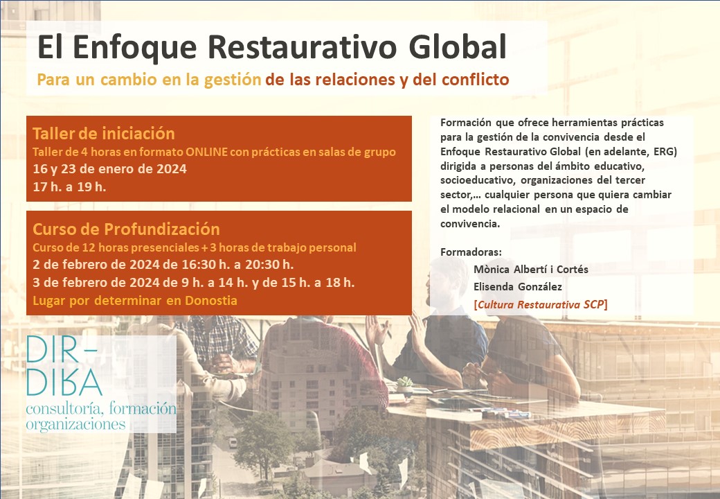 Presentamos una novedosa formación que ofrece herramientas prácticas para la gestión de la convivencia desde el Enfoque Restaurativo Global (en adelante, ERG) dirigida a personas del ámbito educativo, socioeducativo, organizaciones del tercer sector,… cualquier persona que quiera cambiar el modelo relacional en un espacio de convivencia.