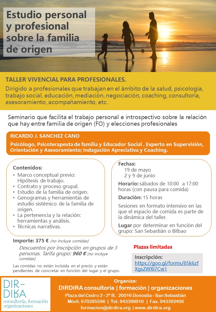 Seminario que facilita el trabajo personal e introspectivo sobre la relación que hay entre familia de origen (FO) y elecciones profesionales. Dirigido a profesionales que trabajan en el ámbito de la salud, psicología, trabajo social, educación, mediación, negociación, coaching, consultoría, asesoramiento, acompañamiento, etc.